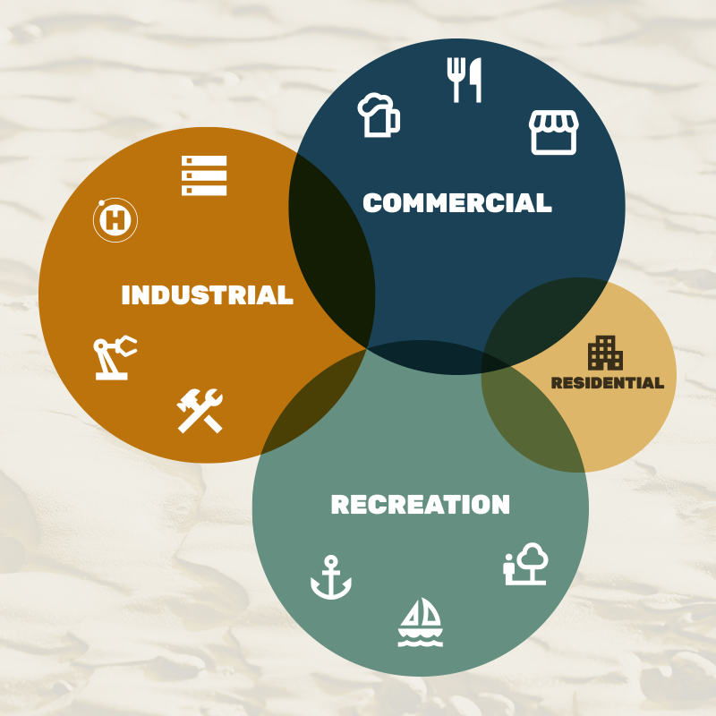 The Waterfront District is made up of multiple parcels (see Property Summary). There are three primary private owners that comprise the property.